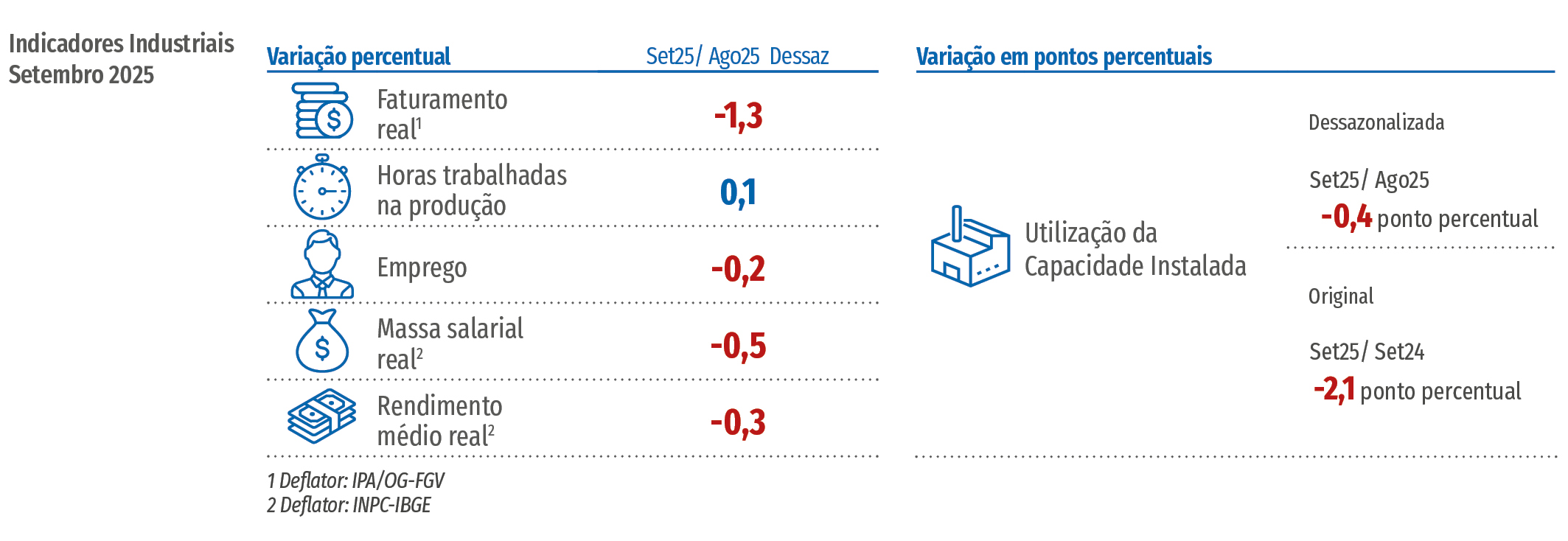 Os Indicadores Industriais mostram uma piora da situação da Indústria de transformação em setembro. O faturamento real, o emprego, a massa salarial e a utilização da capacidade instalada recuaram na passagem de agosto para setembro. O número de horas trabalhadas na produção e o rendimento médio do trabalhador permaneceram estáveis na mesma comparação.