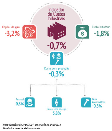 Indicador de Custos Industriais teve queda de 0,7% no segundo trimestre em relação aos primeiros três meses do ano. Essa foi a primeira redução no índice desde o primeiro trimestre de 2013, informa o indicador divulgado nesta sexta-feira, 5 de setembro, pela Confederação Nacional da Indústria (CNI). A queda foi puxada, principalmente, pela redução de 3,2% nos custos com capital de giro e de 1,8% com tributos no período.