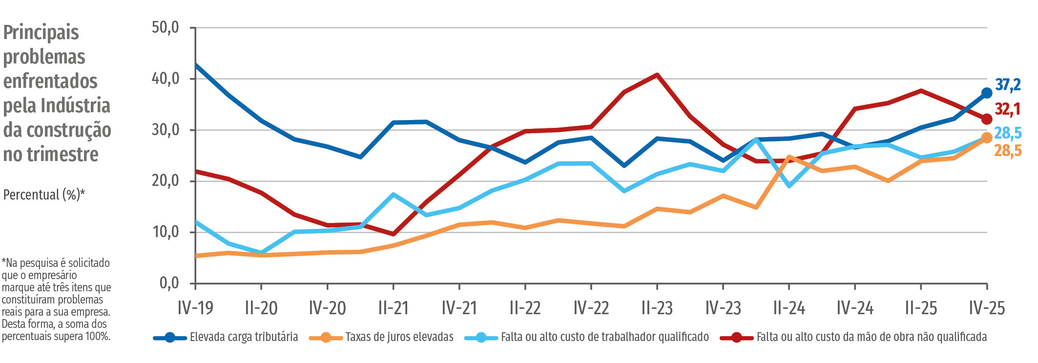 No quarto trimestre de 2025, entre os principais problemas enfrentados pelo setor, os empresários destacaram a elevada carga tributária, as taxas de juros elevadas e a falta ou o alto custo de trabalhadores, qualificados ou não. No mesmo período, a percepção dos empresários sobre as condições financeiras da indústria da construção revela um quadro ainda desafiador, marcado pela elevada dificuldade de acesso ao crédito e pelo aumento da insatisfação com o lucro operacional. Apesar de leves avanços, como na melhora na percepção sobre a situação financeira, os índices permanecem majoritariamente abaixo da linha dos 50 pontos, indicando que a insatisfação segue predominante no setor.