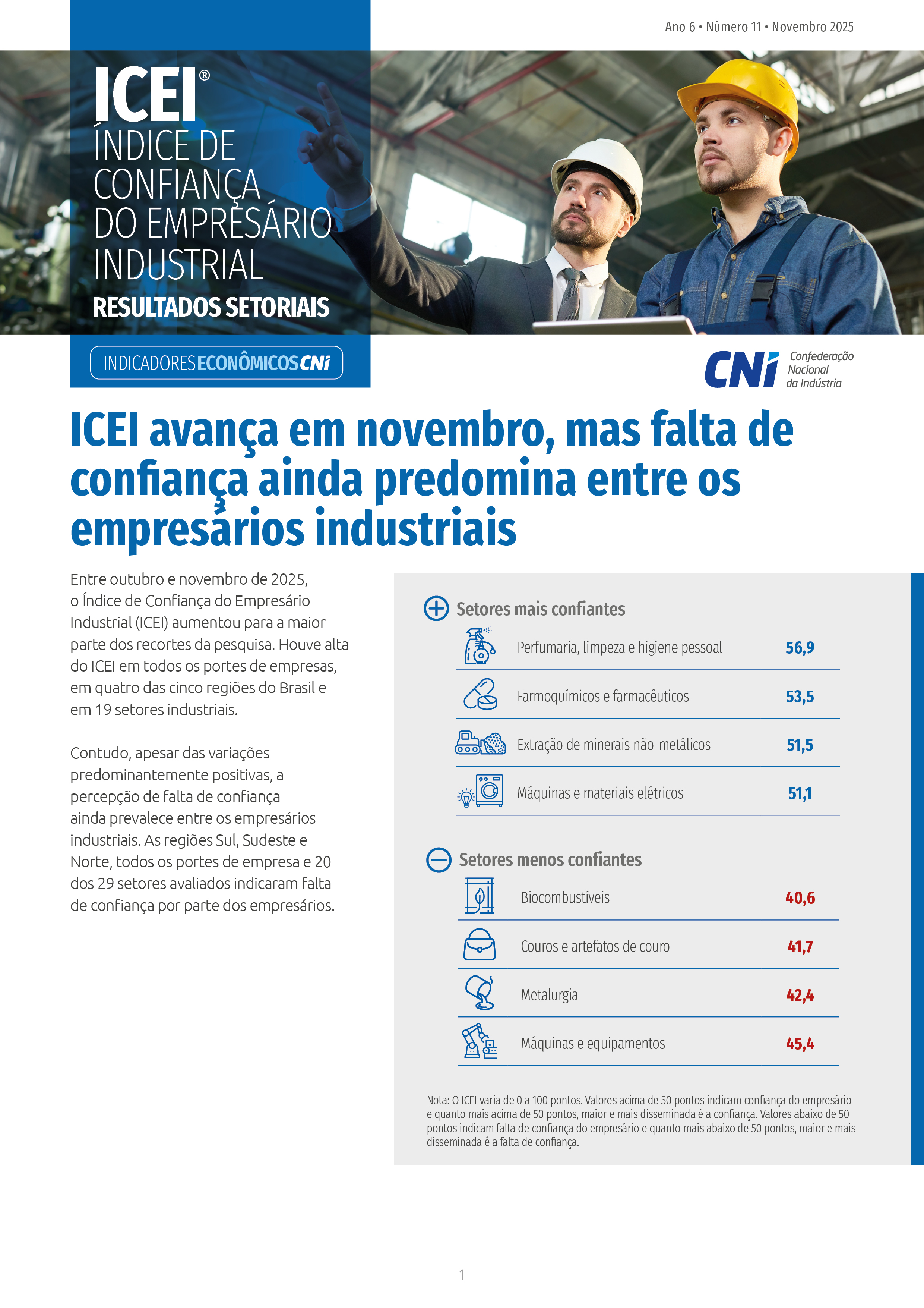 Em novembro de 2025, o Índice de Confiança do Empresário Industrial (ICEI) ficou em 48,3 pontos. Trata-se da terceira alta consecutiva, recuperando parte da queda vista em meses anteriores e se aproximando do patamar visto em junho de 2025 (48,6 pontos). Mesmo com a alta, o ICEI completou onze meses consecutivos de falta de confiança, abaixo de 50 pontos. Com a alta do ICEI, a percepção de falta de confiança persiste, mas se tornou mais moderada.