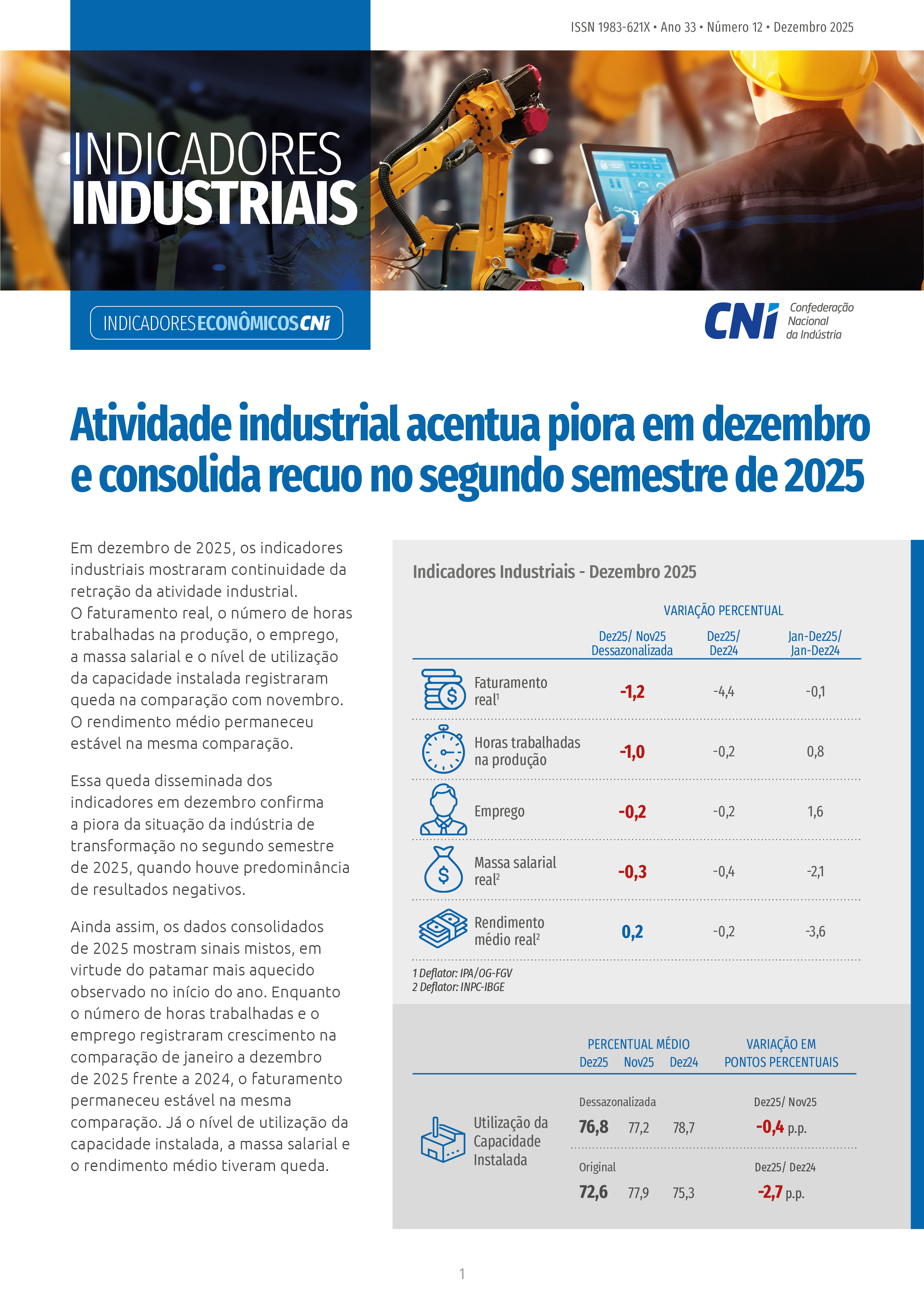 Em janeiro de 2026, o Índice de Confiança do Empresário Industrial (ICEI) registrou alta de 0,5 ponto, passando de 48,0 pontos para 48,5 pontos. Apesar do avanço, o ICEI permanece abaixo da marca de 50 pontos, indicando a continuidade do cenário de baixa confiança observado em todo o ano de 2025 entre os empresários do setor industrial. Destaca-se que esse é o pior resultado para o mês de janeiro desde 2016, quando o indicador registrou 36,6 pontos.