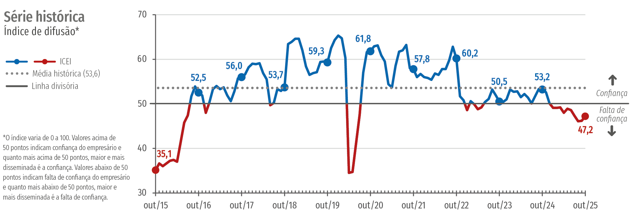 O Índice de Confiança do Empresário Industrial (ICEI) ficou em 47,2 pontos em outubro de 2025, após alta de 1,0 ponto frente o mês anterior. Mesmo com a alta, o ICEI completou dez meses consecutivos de falta de confiança – valores abaixo de 50 pontos mostram falta de confiança. Com a alta do ICEI, a percepção de falta de confiança persiste, mas se tornou mais moderada.