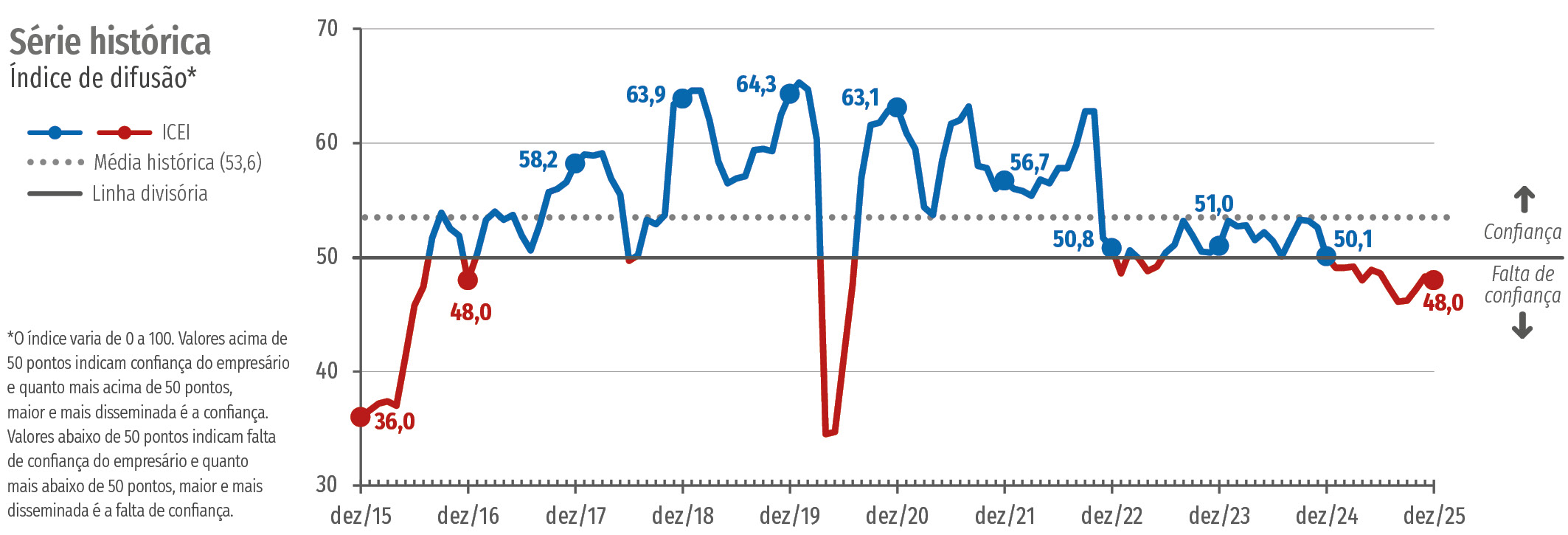 O Índice de Confiança do Empresário Industrial (ICEI) encerrou dezembro de 2025 em 48,0 pontos, após recuo de 0,3 ponto em relação ao mês anterior. A queda interrompeu a sequência de três altas consecutivas observadas entre setembro e novembro, sem, contudo, reverter o quadro geral de pessimismo: ao longo de todo o ano de 2025, o indicador permaneceu abaixo da linha de 50 pontos, sinalizando falta persistente de confiança entre os empresários industriais.