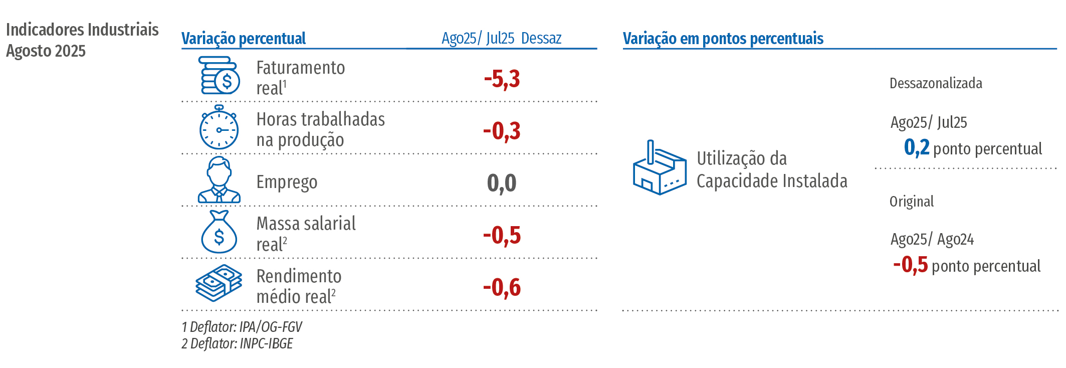 Os Indicadores Industriais mostram resultados em sua maioria negativos em agosto de 2025. Depois de dar sinais de perda de ritmo ao longo do primeiro semestre de 2025, na passagem de julho para agosto houve queda em quase todos os indicadores, exceto emprego, que mostra o quarto mês consecutivo de estabilidade, e utilização da capacidade instalada, que cresceu.