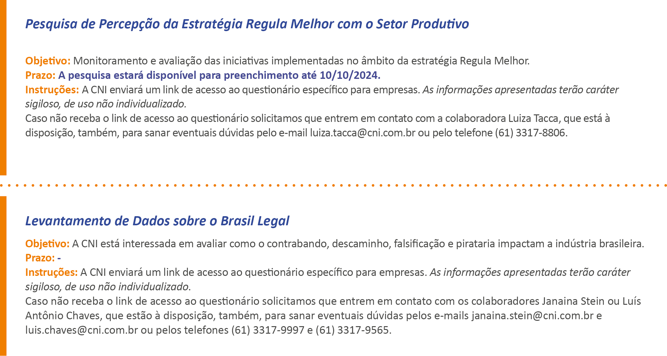 No momento, as seguintes pesquisas, elaboradas pela Confederação Nacional da Indústria, estão em andamento: "Pesquisa de Percepção da Estratégia Regula Melhor com o Setor Produtivo" e "Levantamento de Dados sobre o Brasil Legal".