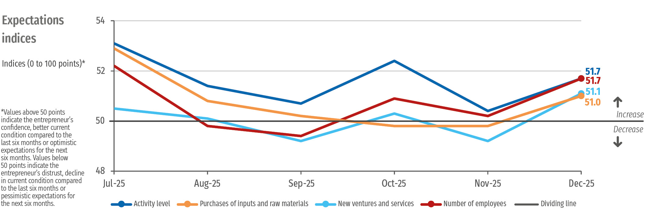 The Construction Industry expectations indices increased in the passage from November to December 2025. With this, indices that were below or above the 50-point line threshold crossed over or moved away from it into the positive field. As a result, all indices moved into the optimistic field, indicating that by the start of 2026, entrepreneurs expect growth in terms of level and activity, as well as new projects and services, and also expect to increase purchases of inputs and raw materials and increase the number of employees in their companies.