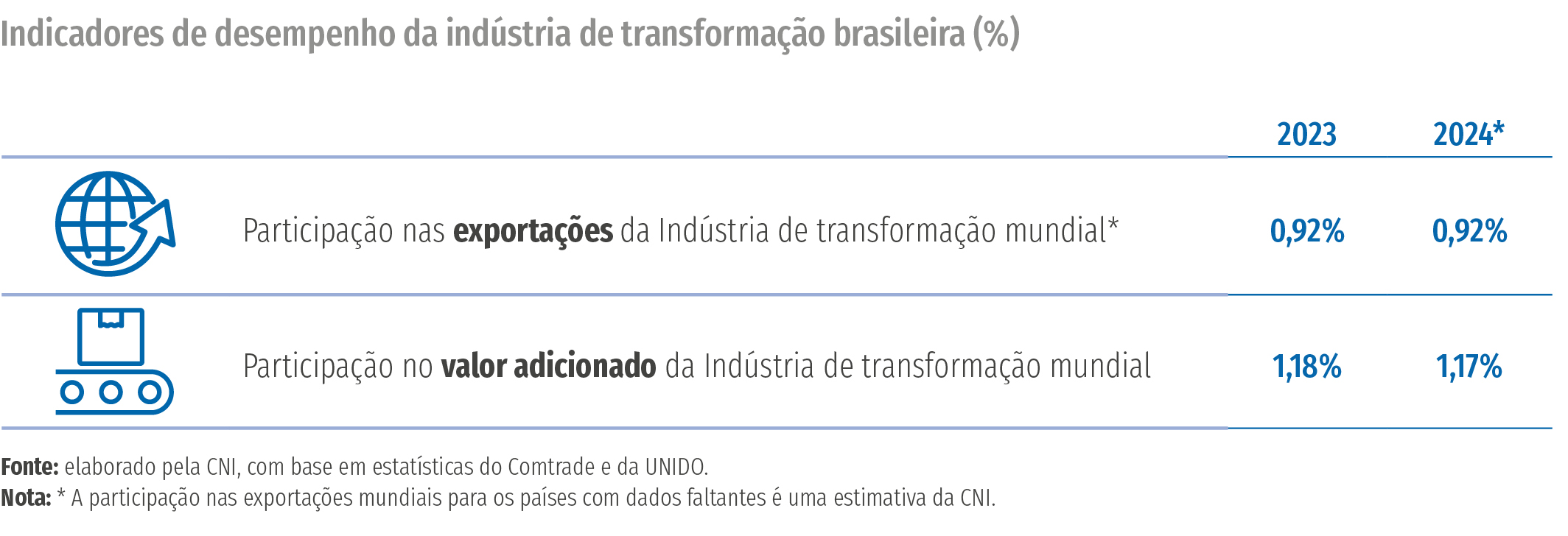 A publicação Desempenho da Indústria no Mundo apresenta o cálculo das participações do Brasil e de seus principais parceiros comerciais nas exportações mundiais de produtos manufaturados e no valor adicionado mundial de produtos manufaturados. O objetivo é acompanhar a evolução da competitividade da indústria brasileira. O desempenho do Brasil em comparação com o desempenho dos demais países reflete sua competitividade.