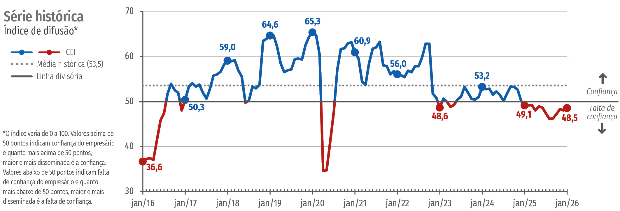 Em janeiro de 2026, o Índice de Confiança do Empresário Industrial (ICEI) registrou alta de 0,5 ponto, passando de 48,0 pontos para 48,5 pontos. Apesar do avanço, o ICEI permanece abaixo da marca de 50 pontos, indicando a continuidade do cenário de baixa confiança observado em todo o ano de 2025 entre os empresários do setor industrial. Destaca-se que esse é o pior resultado para o mês de janeiro desde 2016, quando o indicador registrou 36,6 pontos.