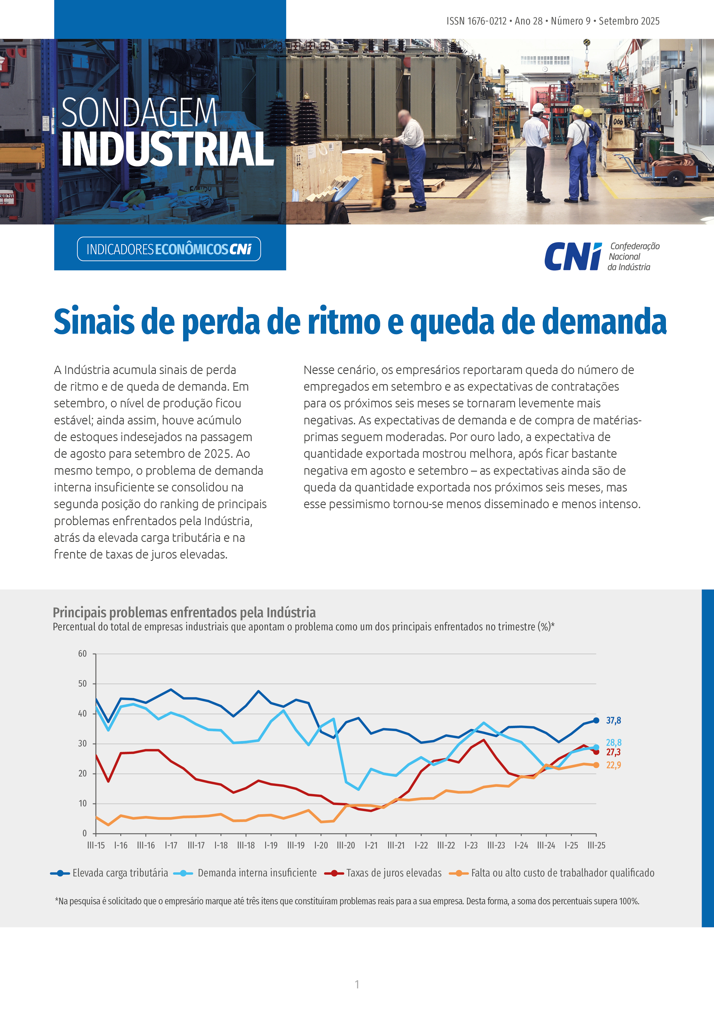 O Índice de Confiança do Empresário Industrial (ICEI) ficou em 47,2 pontos em outubro de 2025, após alta de 1,0 ponto frente o mês anterior. Mesmo com a alta, o ICEI completou dez meses consecutivos de falta de confiança – valores abaixo de 50 pontos mostram falta de confiança. Com a alta do ICEI, a percepção de falta de confiança persiste, mas se tornou mais moderada.