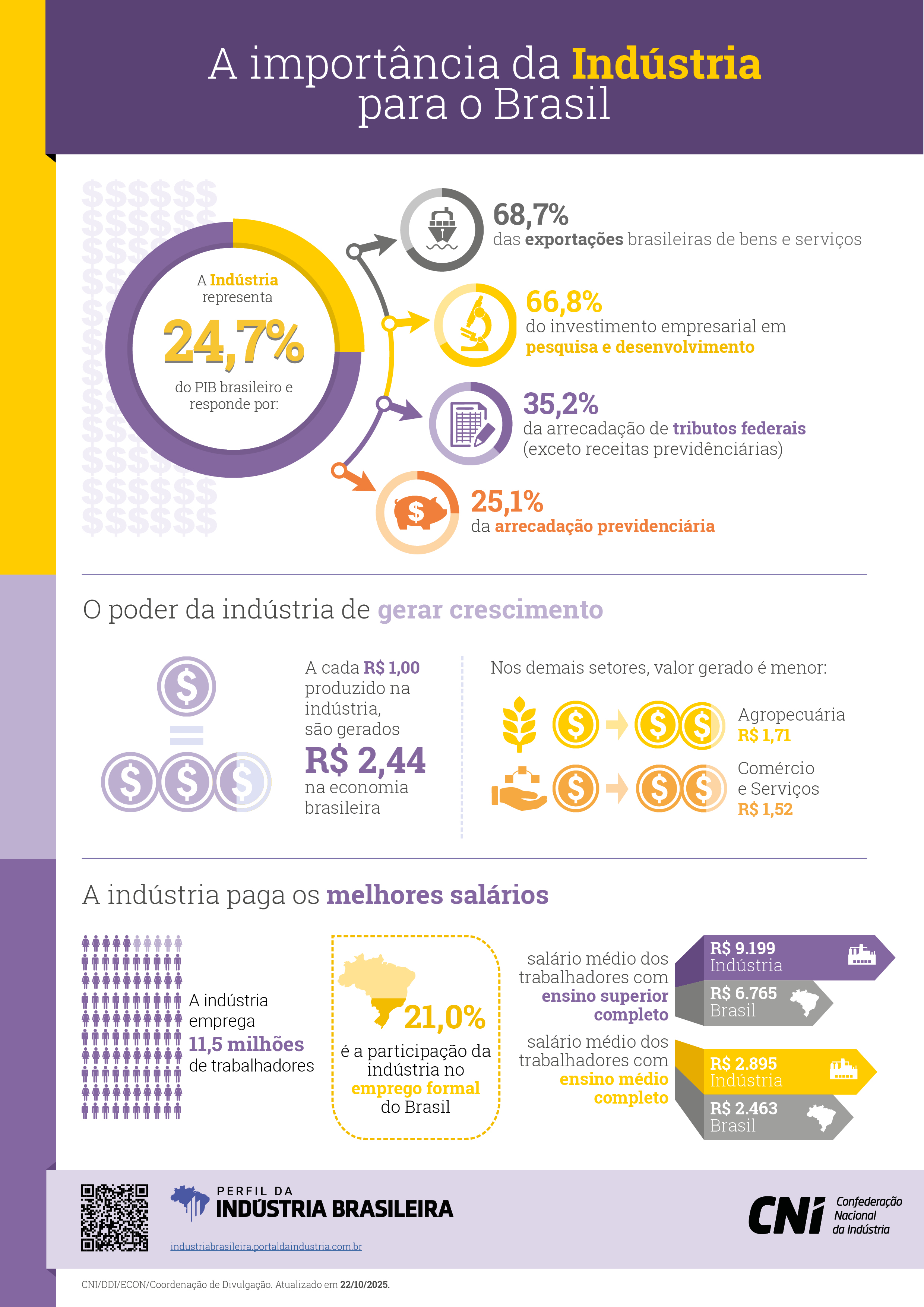 A Indústria em Números permite acompanhar o desempenho recente da indústria brasileira e conhecer seu perfil. Um conjunto de indicadores selecionados descreve a situação atual da indústria, como os indicadores de produção, emprego, faturamento e exportação. Estatísticas estruturais mostram a importância da indústria para a economia brasileira, sua competitividade e a dinâmica dos setores na produção industrial.