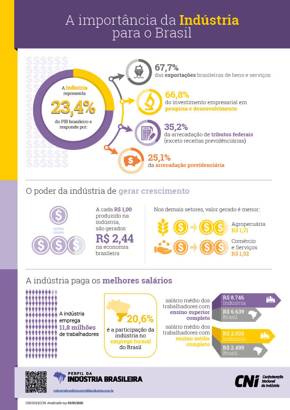 A Indústria em Números permite acompanhar o desempenho recente da indústria brasileira e conhecer seu perfil. Um conjunto de indicadores selecionados descreve a situação atual da indústria, como os indicadores de produção, emprego, faturamento e exportação. Estatísticas estruturais mostram a importância da indústria para a economia brasileira, sua competitividade e a dinâmica dos setores na produção industrial.