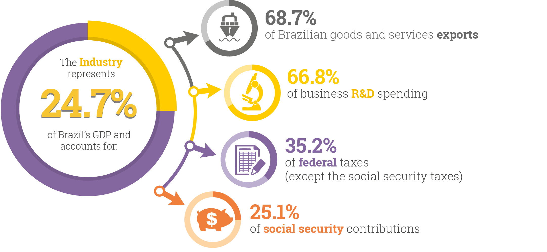 The Industry’s importance in Brazil and the Manufacturing’s importance in Brazil present the role of Brazilian industry in the country’s economy. The importance of the sector is measured in production, formal employment and wages, exports, innovation expenditures and collected taxes.