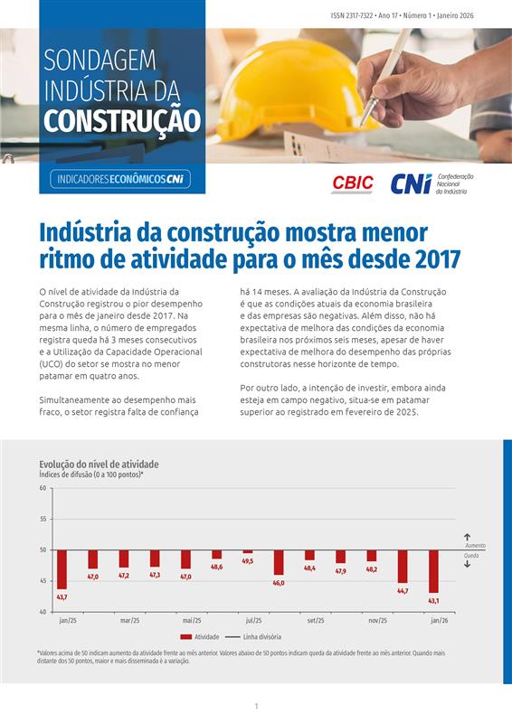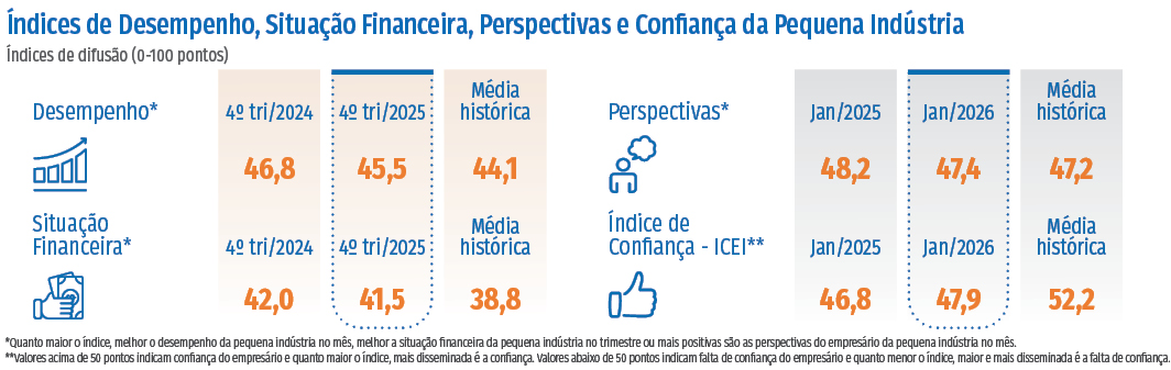 No quarto trimestre de 2025, a elevada carga tributária permaneceu no topo do ranking dos principais problemas das indústrias de pequeno porte brasileiras. O desempenho e a situação financeira dessas indústrias se mantiveram em patamares relativamente positivos, apesar da leve queda observada no fim de 2025. O Índice de Perspectivas das pequenas indústrias oscilou em torno da média histórica ao longo de 2025 e começou 2026 exibindo alguma moderação. Já o Índice de Confiança das empresas de pequeno porte completou o 14º mês consecutivo abaixo dos 50 pontos, indicando falta de confiança por parte dos empresários.