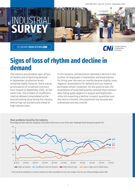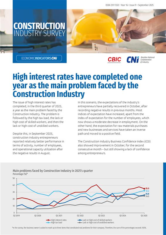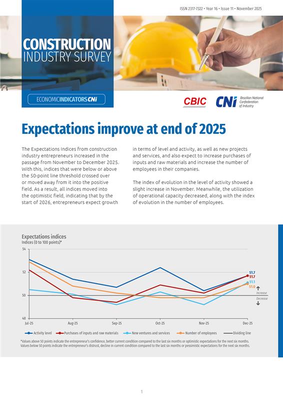 The Small Industry Outlook analyzes, on a quarterly basis, small industry data collected by the Industrial Survey, Construction Industry Survey, and Business Confidence Index. The Outlook includes three new indices: the Performance Index, which measures the performance of small industry activity in the quarter; the Financial Situation Index, which assesses the financial situation of small enterprises; and the Outlook Index, which reveals business expectations. The survey also analyzes the main problems faced by small industry and the behavior of the ICEI index, considering only small companies.