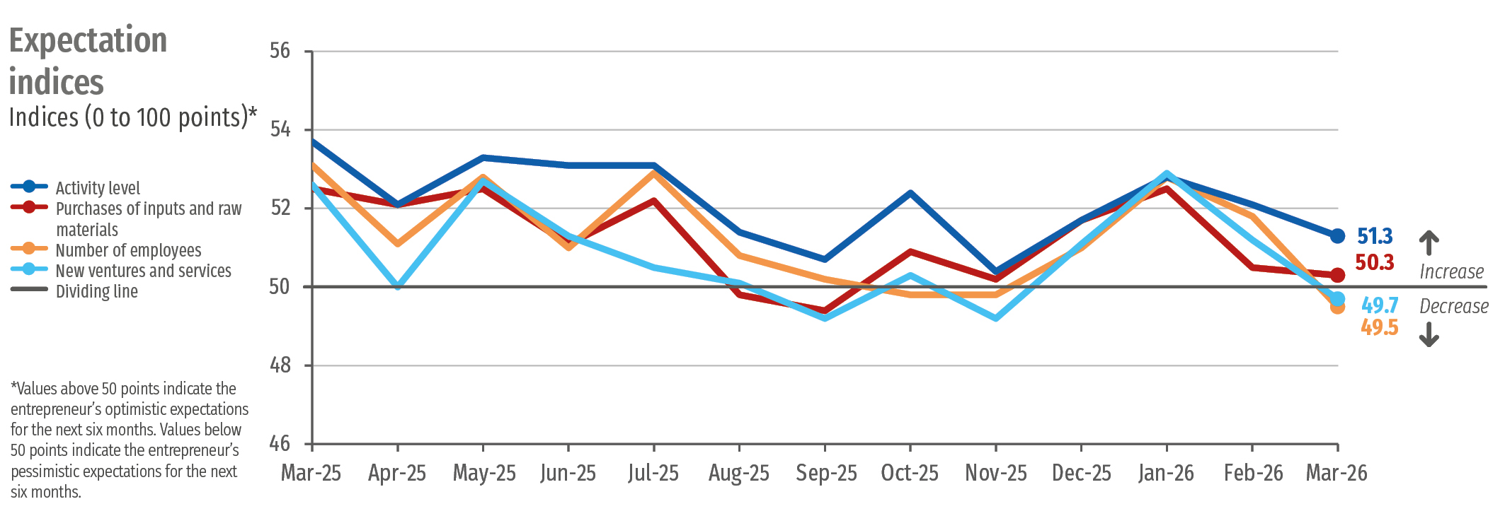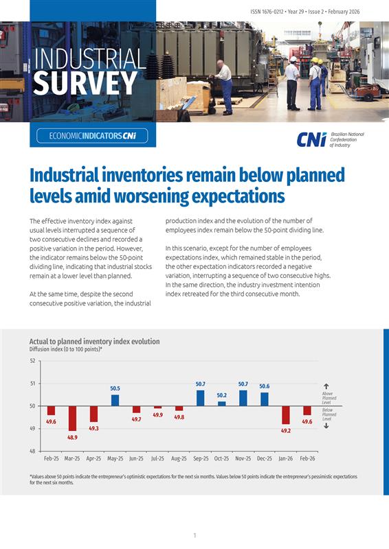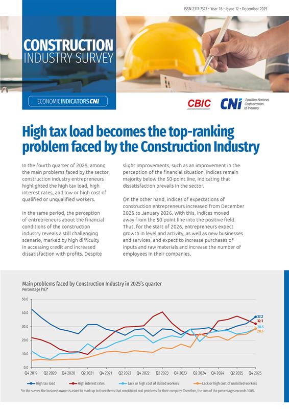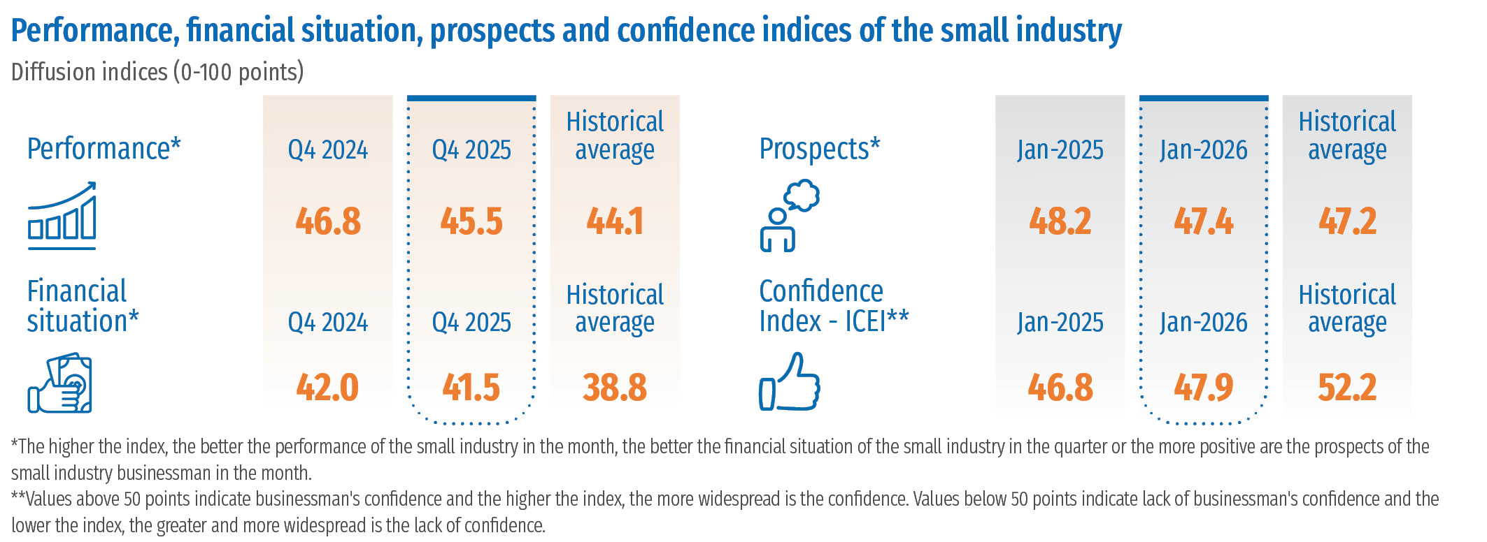 In the fourth quarter of 2025, the high tax burden remained at the top of the ranking of the main problems facing small-scale Brazilian industries. The performance and financial situation of these industries remained at relatively positive levels, despite a slight decline observed at the end of 2025. The outlook for small-scale industries fluctuated around the historical average throughout 2025 and began 2026 showing some moderation. Meanwhile, the Small Business Confidence Index completed its 14th consecutive month below 50 points, indicating a lack of confidence among business owners.