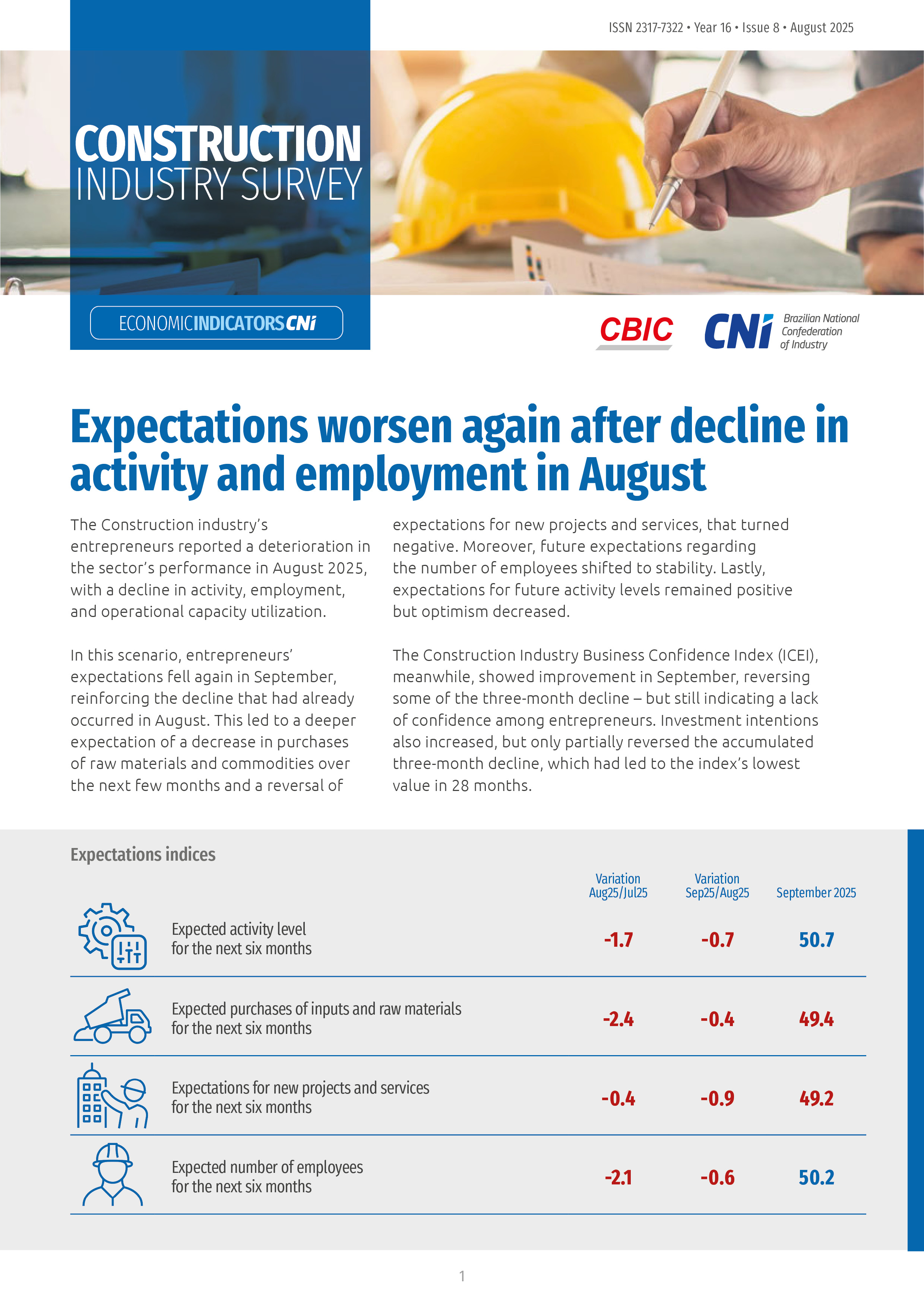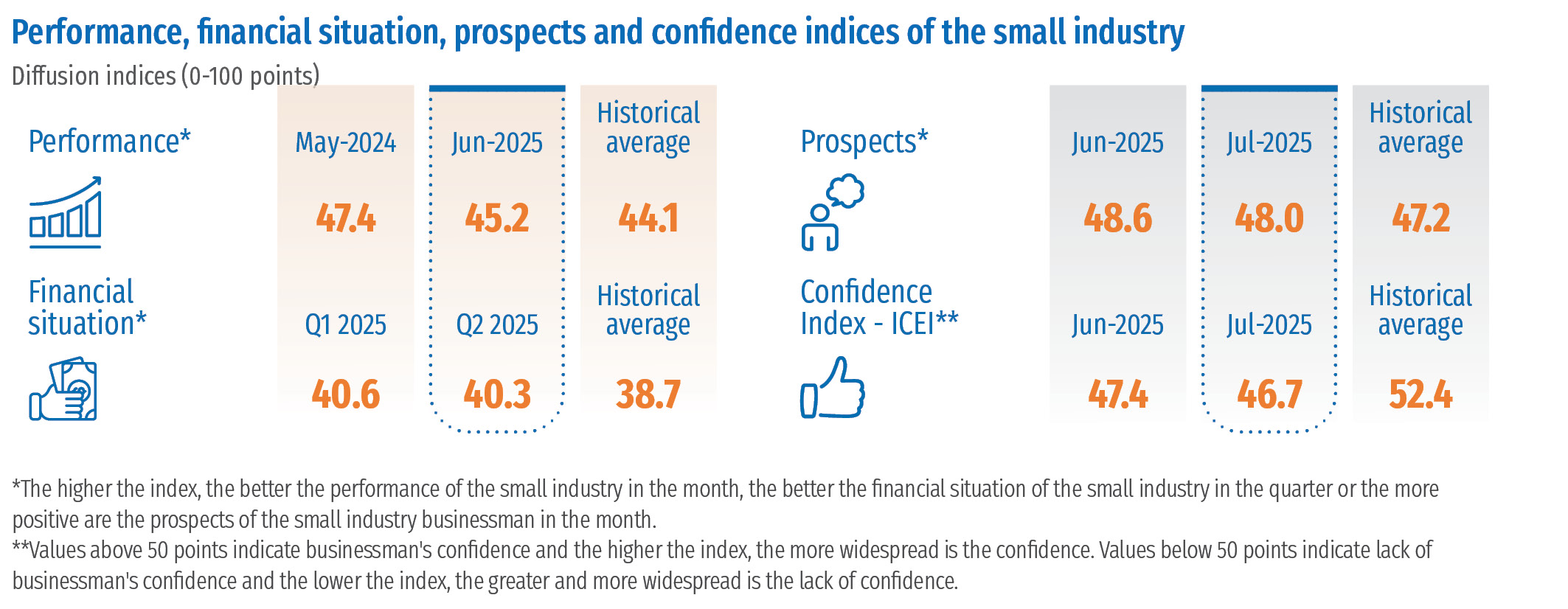 The Small Industry Outlook analyzes, on a quarterly basis, small industry data collected by the Industrial Survey, Construction Industry Survey, and Business Confidence Index. The Outlook includes three new indices: the Performance Index, which measures the performance of small industry activity in the quarter; the Financial Situation Index, which assesses the financial situation of small enterprises; and the Outlook Index, which reveals business expectations. The survey also analyzes the main problems faced by small industry and the behavior of the ICEI index, considering only small companies.