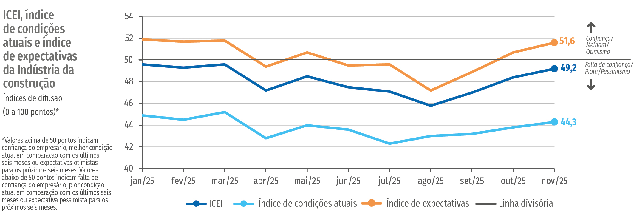 Em novembro, o Índice de Confiança do Empresário Industrial (ICEI) da Indústria da construção registrou a terceira elevação consecutiva e alcançou 49,2 pontos. O índice aumentou 3,4 pontos no período, passando de uma situação de falta de confiança intensa e disseminada para uma situação cada vez menos negativa. Essa melhora se deve às expectativas com relação à economia e suas empresas de forma mais ampla, mas a análise de expectativas mais pontuais revela certa cautela do empresário.
