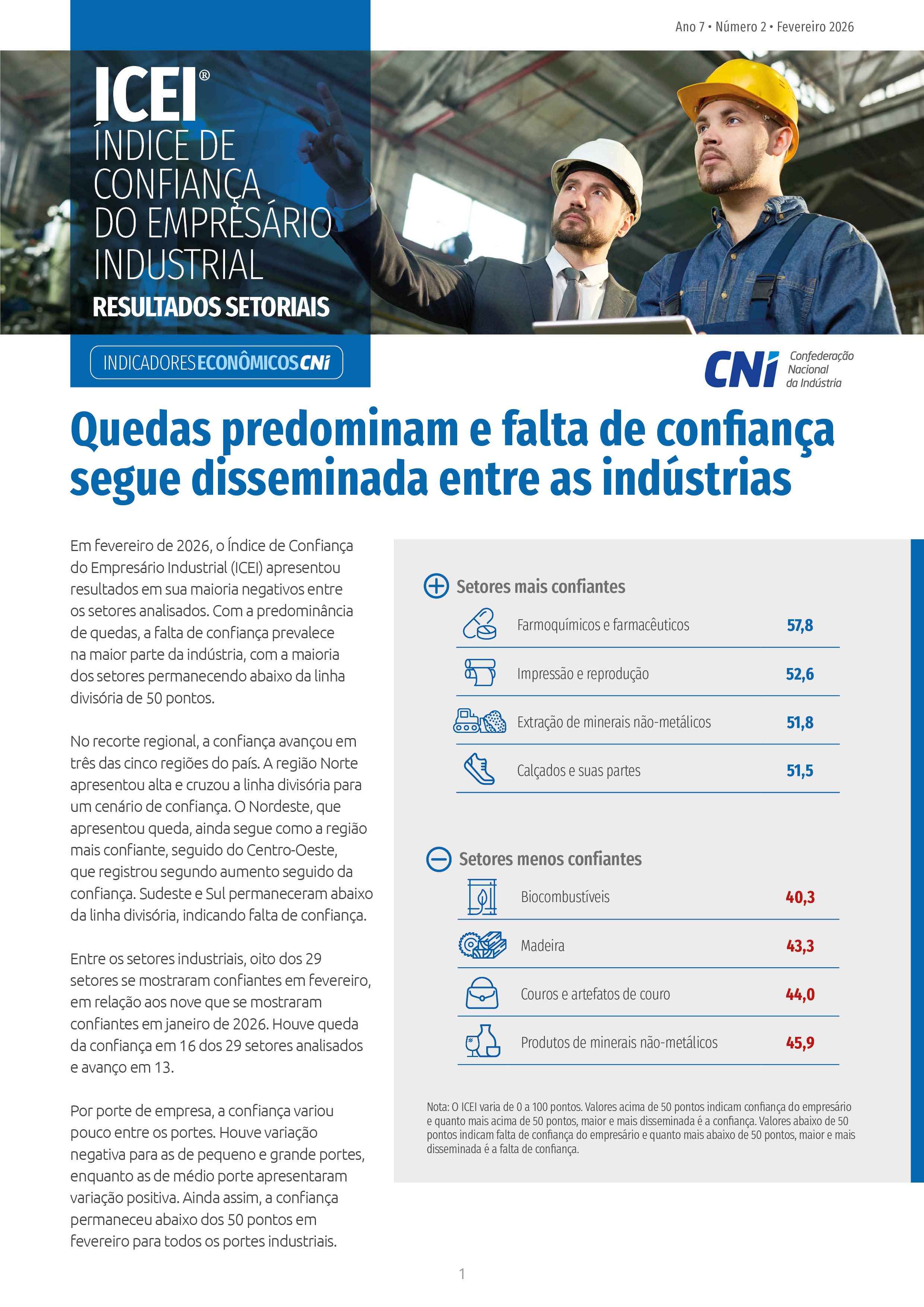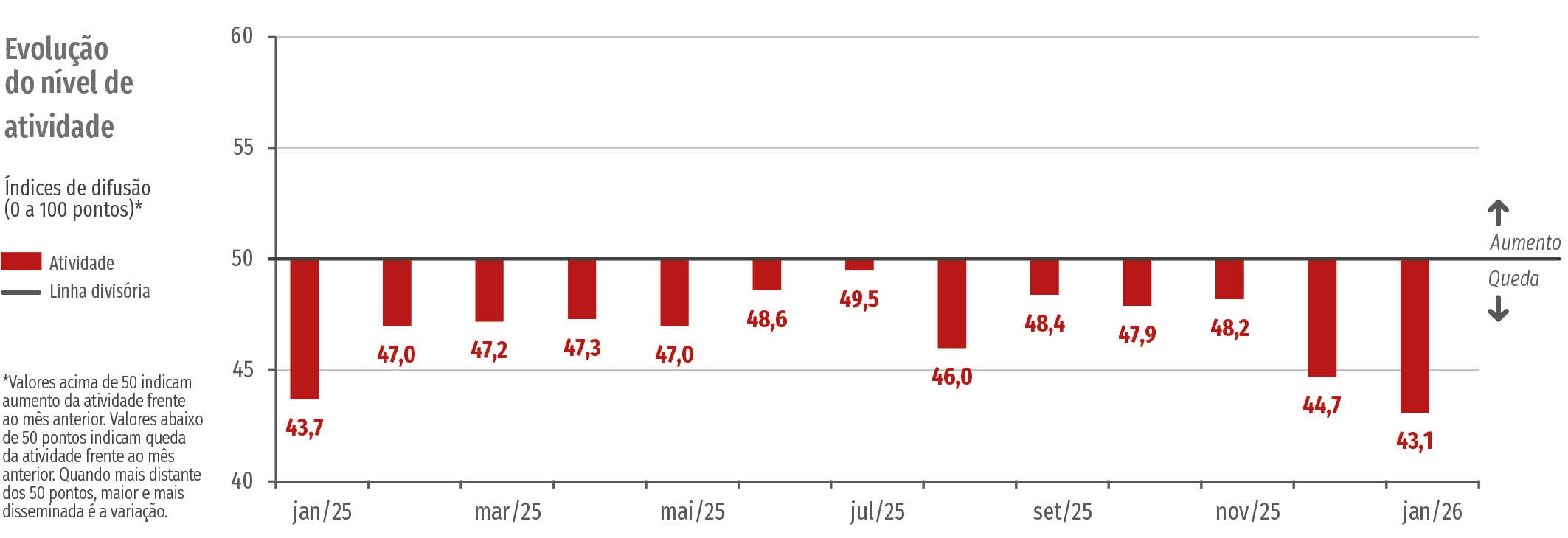 O nível de atividade da Indústria da construção registrou o pior desempenho para o mês de janeiro desse 2017. Na mesma linha, o número de empregados registra queda há 3 meses consecutivos e a Utilização da Capacidade Operacional (UCO) do setor se mostra no menor patamar em quatro anos. Simultaneamente ao desempenho mais fraco, o setor registra falta de confiança há 14 meses. A avaliação da Indústria da construção é que as condições atuais da economia brasileira e das empresas são negativas. Além disso, não há expectativa de melhora das condições da economia brasileira nos próximos seis meses, apesar de haver expectativa de melhora do desempenho das próprias construtoras nesse horizonte de tempo.