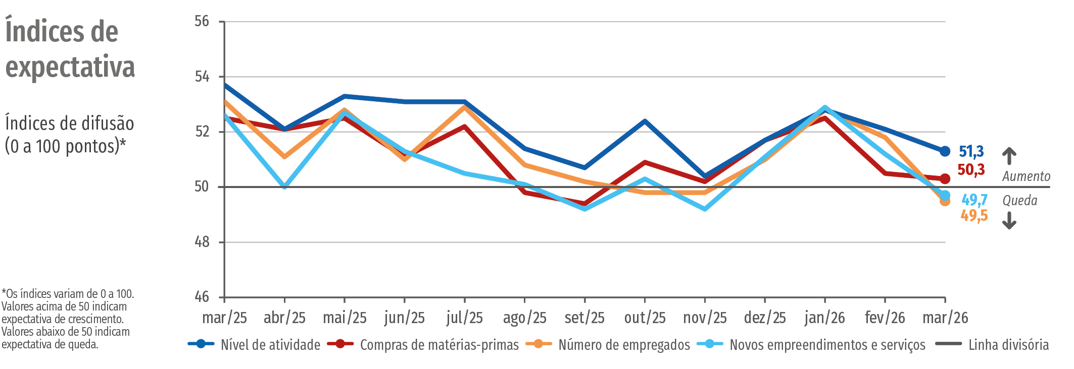 Os índices relacionados ao desempenho da Construção apresentaram melhora na passagem de fevereiro para março de 2026. Enquanto o índice de evolução do nível de apresentou alta de 2,6 pontos, o índice de evolução do número de empregados avançou 1,7 ponto. Apesar da alta, ambos os índices são menores que o registrado em fevereiro de 2025. Apesar desse desempenho, os indicadores de confiança e de expectativas mostram um cenário menos favorável. Na mesma direção, os indicadores de expectativas também registraram queda pelo segundo mês consecutivo.