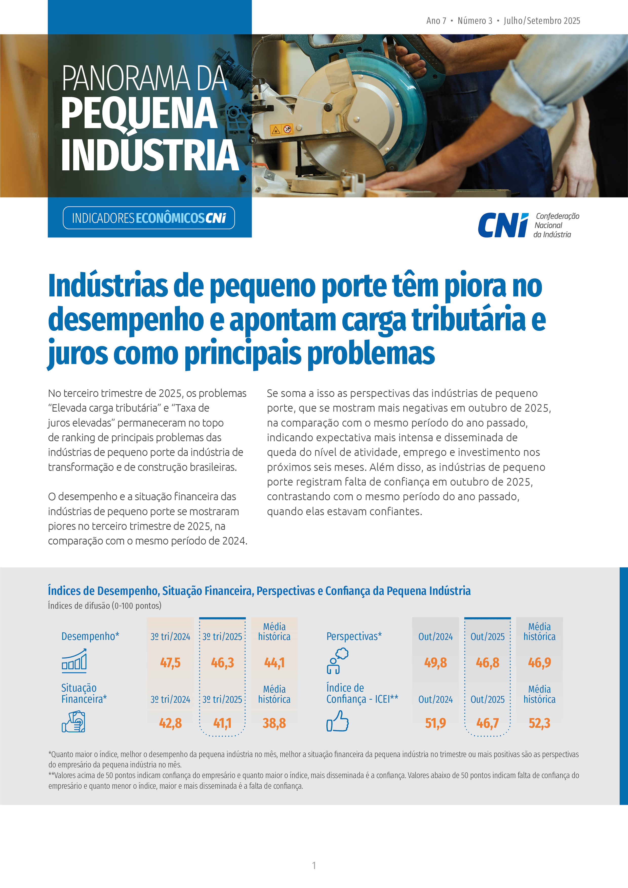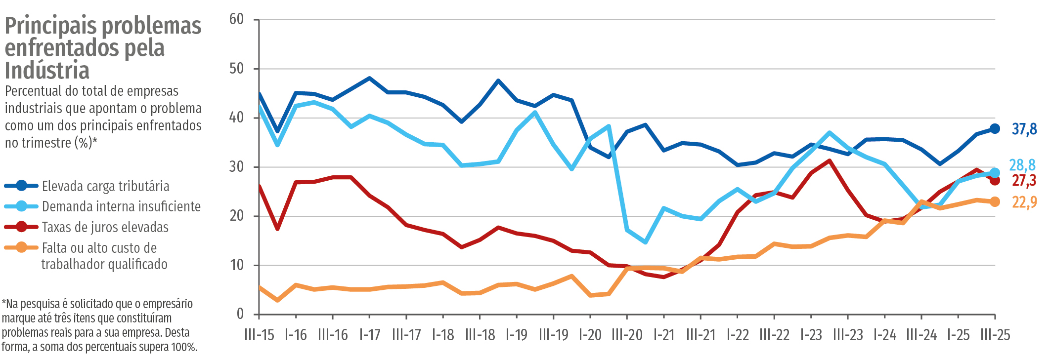 A Indústria acumula sinais de perda de ritmo e de queda de demanda. Em setembro, o nível de produção ficou estável; ainda assim, houve acúmulo de estoques indesejados na passagem de agosto para setembro de 2025. Ao mesmo tempo, o problema de demanda interna insuficiente se consolidou na segunda posição do ranking de principais problemas enfrentados pela Indústria, atrás da elevada carga tributária e na frente de taxas de juros elevadas.