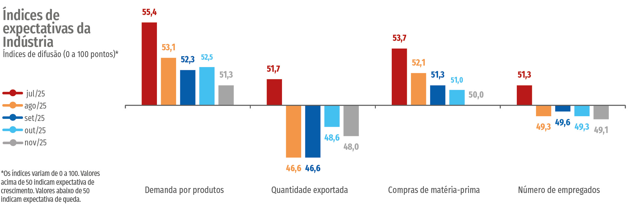 Em outubro de 2025, a indústria brasileira apresentou crescimento da produção. Além disso, o ritmo de acúmulo de estoques foi moderado, o que levou os estoques para um nível muito próximo do planejado pelas empresas. Já a Utilização da Capacidade Instalada (UCI) permaneceu estável. Por outro lado, o número de empregados caiu na passagem de setembro para outubro. Além disso, o índice de expectativa de número de empregados para os próximos seis meses recuou e segue mostrando expectativa de queda das contratações pelo quarto mês consecutivo.