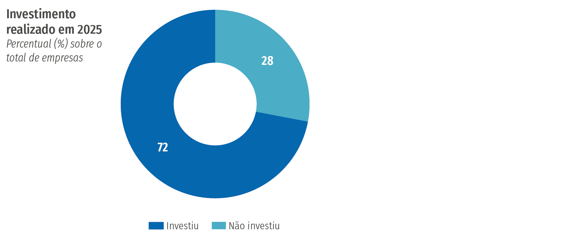 A maioria das empresas industriais realizou investimentos em 2025, ainda que a execução dos projetos tenha sido parcialmente afetada por um ambiente econômico marcado por incertezas. Em relação a 2026, 56% das empresas pretendem realizar investimentos. Entre essas empresas, 62% indicam que os investimentos fazem parte de planos já em andamento, enquanto 31% planejam iniciar novos projetos.