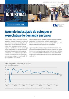 Em novembro, como é usual para o período, a atividade industrial diminuiu na comparação com os meses anteriores. Em 2025, chama à atenção que a queda de ritmo da atividade industrial foi significativa, com uma queda expressiva do índice de evolução de produção. Importante destacar que, ao mesmo tempo, a utilização da capacidade instalada, que já vinha menor que a de 2024, caiu para abaixo também do registrado em 2023 – em 70%, é o menor percentual para o mês desde 2019, quando também ficou em 70%. Destaca-se que, mesmo após esse considerável desaquecimento da atividade em novembro, os estoques variaram pouco, frustrando o escoamento da produção, uma vez que a avaliação dos empresários é de que o nível e estoques encerrou novembro acima do planejado.