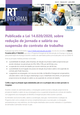 Publicada hoje (DOU 07/07/2020) a Lei n.º 14.020, de 6 de julho de 2020, oriunda da conversão da Medida Provisória (MPv) nº 936/2020, que criou o Programa Emergencial de Manutenção do Emprego e da Renda para preservação de empregos durante o estado de calamidade pública provocada pela crise da COVID-19. Saiba as principais medidas previstas na lei neste RT Informa.