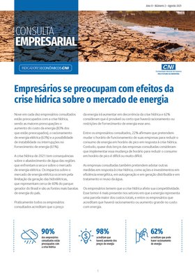 Nove em cada dez empresários consultados estão preocupados com a crise hídrica, sendo as maiores preocupações o aumento do custo da energia, o racionamento de energia elétrica e a possibilidade de instabilidade ou interrupções no fornecimento de energia.