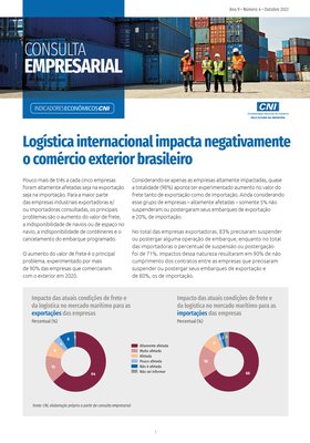 As condições de frete e logística no mercado marítimo causadas pela pandemia impactaram sobremaneira o comércio internacional. Entre as empresas industriais brasileiras consultadas, 79% das que exportam foram muito ou altamente impactadas pelas atuais condições de frete e logística no mercado marítimo de exportações, enquanto entre as que importam, 84% foram muito ou altamente afetadas. A série de fatores que desencadeou a desordem do transporte marítimo internacional, acirrou a disputa por navios e/ou espaços e por contêineres e elevou o valor de frete.