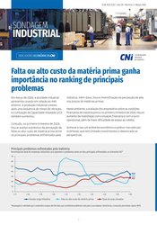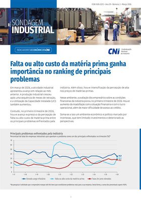 No primeiro trimestre de 2026, houve avanço expressivo da percepção de falta ou alto custo de matéria-prima entre os principais problemas enfrentados pela indústria. Além disso, houve intensificação da percepção de alta nos preços de matérias-primas. Nesse ambiente, a avaliação dos empresários sobre as condições financeiras da indústria piorou no primeiro trimestre de 2026. Houve aumento da insatisfação com a situação financeira e com o lucro operacional, além de maior dificuldade de acesso ao crédito.