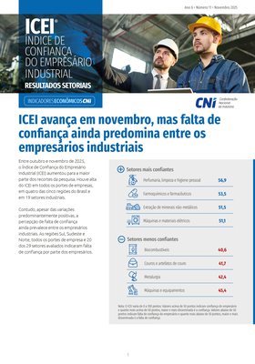 Entre outubro e novembro de 2025, o Índice de Confiança do Empresário Industrial (ICEI) aumentou para a maior parte dos recortes da pesquisa. Houve alta do ICEI em todos os portes de empresas, em quatro das cinco regiões do Brasil e em 19 setores industriais.