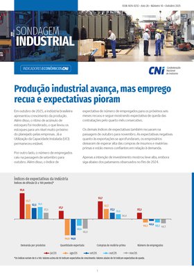 Em outubro de 2025, a indústria brasileira apresentou crescimento da produção. Além disso, o ritmo de acúmulo de estoques foi moderado, o que levou os estoques para um nível muito próximo do planejado pelas empresas. Já a Utilização da Capacidade Instalada (UCI) permaneceu estável. Por outro lado, o número de empregados caiu na passagem de setembro para outubro. Além disso, o índice de expectativa de número de empregados para os próximos seis meses recuou e segue mostrando expectativa de queda das contratações pelo quarto mês consecutivo.