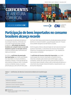 Em 2024, o coeficiente de penetração das importações avançou para o maior patamar da série iniciada em 2003, refletindo a combinação de demanda doméstica aquecida, maior uso de insumos industriais importados e a crescente presença da China no consumo aparente brasileiro.