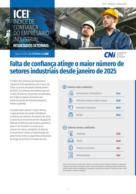 O Índice de Confiança do Empresário Industrial (ICEI) apresentou, em março de 2026, os piores resultados desde janeiro de 2025. A confiança da indústria caiu em 24 dos 29 setores industriais considerados, em todas as regiões do Brasil e em todos os portes de empresa (pequeno, médio e grande).