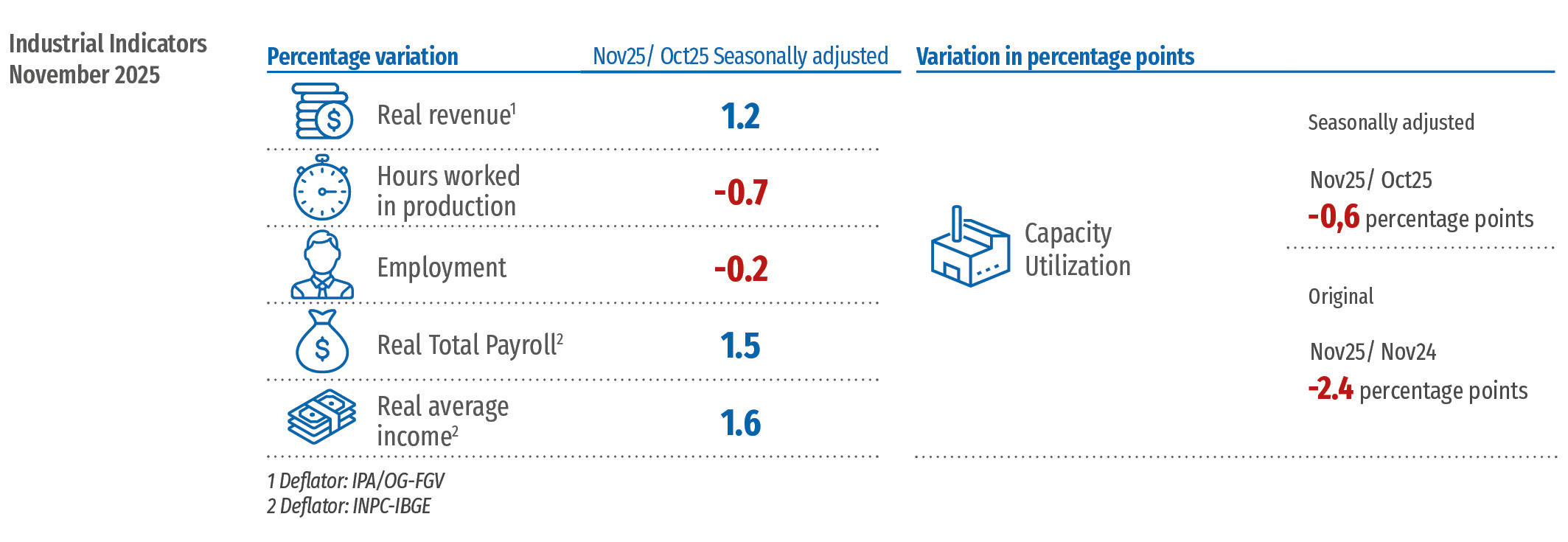 In November 2025, the industry showed mixed performance. Real revenue resumed growth, interrupting three months of decline, as did the payroll and average income, which recorded their first increases after a four-month period of decline.