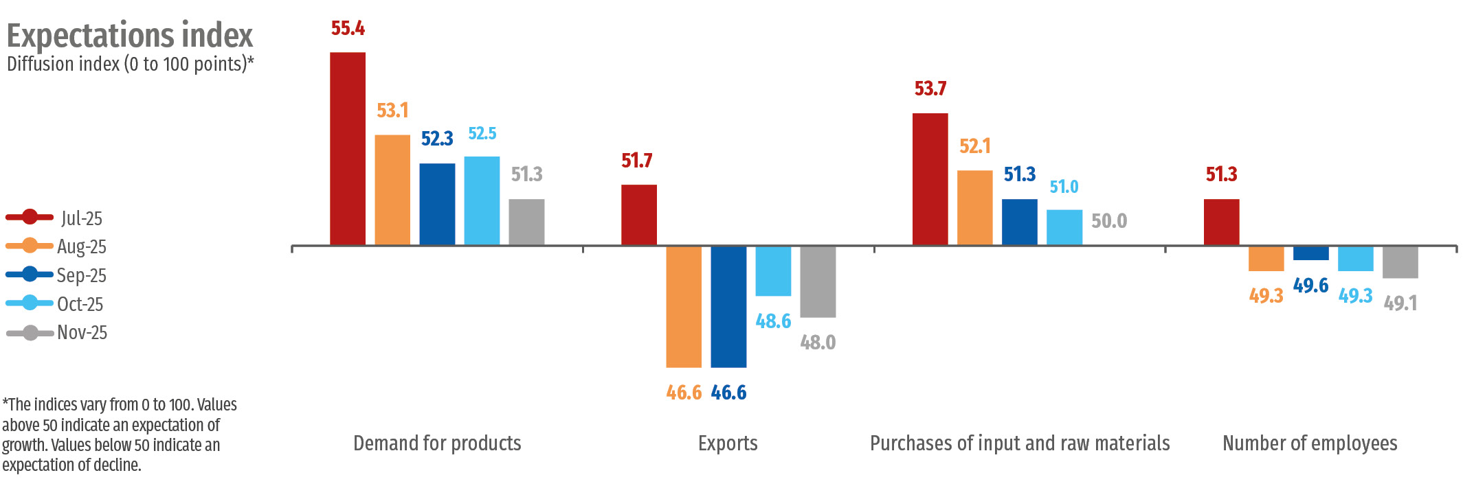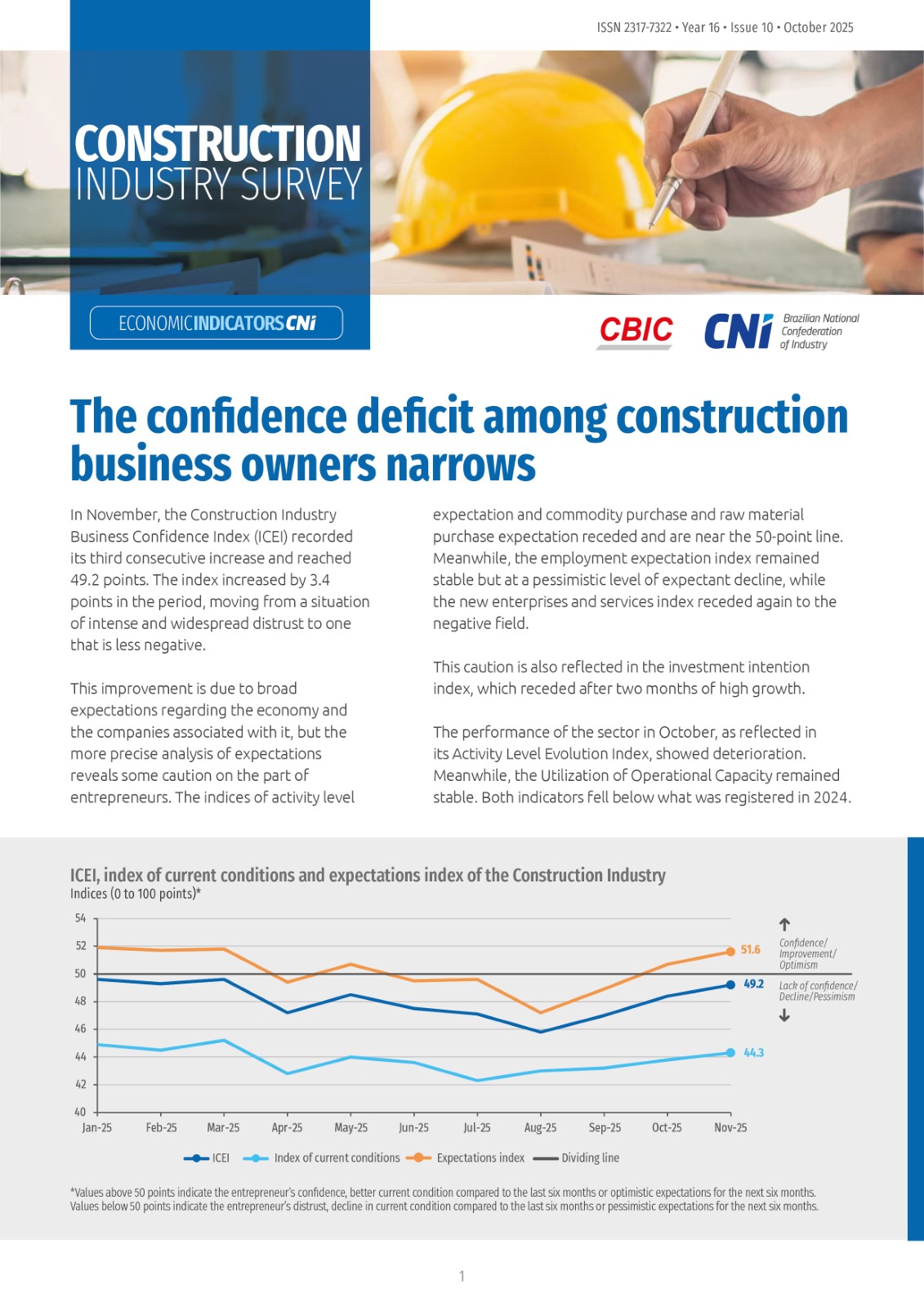 In October 2025, the Brazilian industry presented an increase in production. Additionally, the rate of accumulation of inventory was moderate, leading to inventories at a level very close to that planned by companies. However, the Industrial Capacity Utilization (UCI) remained stable. On the other hand, the number of employees decreased from September to October. Furthermore, the index of expectation for the number of employees over the next six months receded and continues to show a decrease in contractions for the fourth consecutive month.